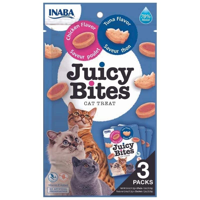 רכיבים עוף, טונה, טעם עוף טבעי, טעם טונה טבעי, טפיוקה, ויטמין E, תמצית פפריקה, תמצית תה ירוק. ערכים תזונתיים חלבון גולמי 24%, שמנים ושומנים גולמיים 2.5%, אפר גולמי 1.4%, סיבים גולמיים 0.5%, רטיבות 71%, ויטמין E 200 יחב”ל/ק”ג. 3 חבילות באריזה כל חבילה 11.3 גרם