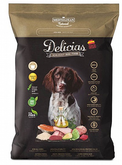 דלישס מזון רך לכלבים בוגרים ומבוגרים 3 ק”ג Delicias המזון מיוצר מבשר טרי ודגים טריים (מינימום 72%) . המרכיבים מבושלים בטמפרטורה נמוכה, כדי לשמור על ערכיהם התזונתיים. משלב בתוכו תוסף גלוקוזמין לחיזוק השלד, המפרקים והסחוסים. רמת לחות של 17.3% העוזרת לעיכול קל ונעים, מתאים גם עבור כלבים בעלי קשיים בעיכול מזון יבש. טעימות גבוהה במיוחד. ניתן לשימוש כחטיף או כמזון ע”ב יום יומי. מבית מדיטרניאן הספרדית. רכיבים: בשר טרי 72% (עוף 37%, חזיר 16%, טונה וסלמון 10%, כבד עוף 5%, כבש 4%), דגנים, גליצרין, גלוקוז, גלוקוזמין, פוטסיום, נוגדי חמצון, שמן אורגנו, חומצה ציטרית. ערכיים תזונתיים: חלבון % 25.2, שומן % 9.4,אפר 8.3% ,סיבים % 0.86, לחות 10.9%,קלציום 2.6% מ”ג/100 ג’,זרחן 1.6 ג’/100 ג’, סודיום 0.77 ג’/100 ג’, מגנזיום 0.14 ג’/ 100 ג’, גלוקוזאמין 25 מ”ג/ק”ג, נחושת 0.02 ג’100 ג’, אומגה 3 0.33 ג100 ג’, אומגה 6 1.7 ג’100 ג’ אומגה 9 4.04 ג’100 ג’