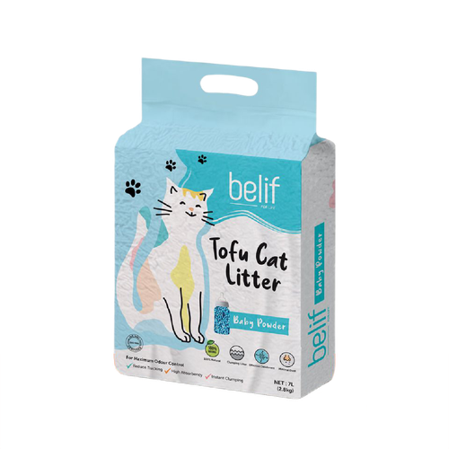 בליף מצע טופו בריח טלק 7 ליטר לחתולים בליף מצע מתגבש טופו לחתולים, Belif Tofu Cat Litter Baby Powder. מצע טופו מתגבש בריח טלק לחתולים. המצע עשוי משבבי טופו טבעיים, ידידותיים לסביבה ומתכלים. שבבי הטופו בטוחים לשימוש של חתולים, נטולי אבק, בעלי כושר ספיגה גבוה ויכולת נטרול ריחות מהירה. המצע קל לניקוי: ניתן להשליך את גושי הפסולת לאסלה או להשתמש בהם כחומר דישון לאדמה. המצע מבושם בריח טלק המפיץ ריח נעים בסביבת ארגז הצרכים של החתול ומספק לו סביבה הגיינית לעשיית צרכים. תכולת אריזה: 7 ליטר.