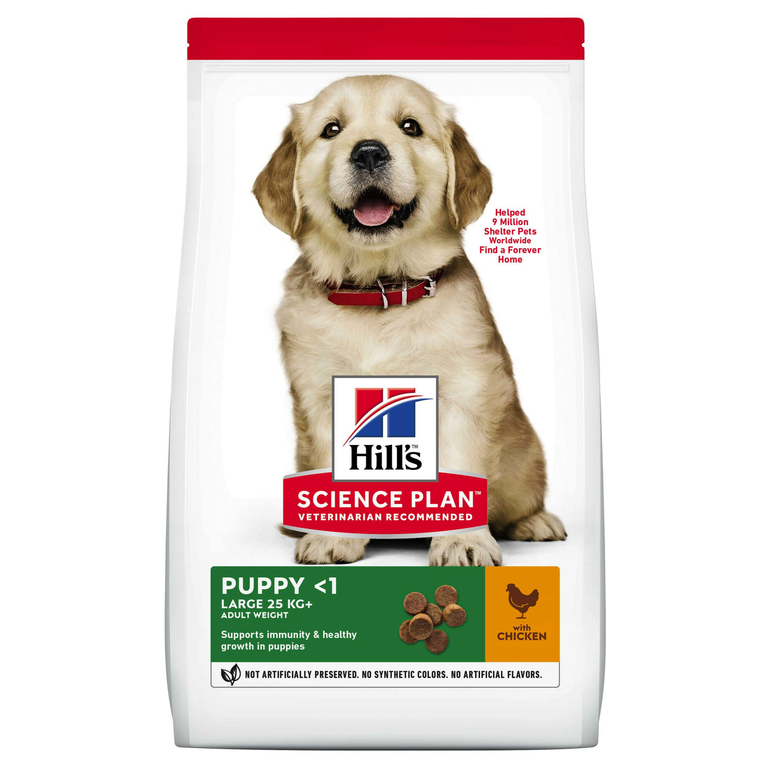 Hill’s Science Plan לגור כלב מגזע גדול (עם עוף) מיוצר במיוחד עם תכולת סידן אופטימלית לגדילה מבוקרת של העצמות, שהוא צורך התפתחותי ייחודי של גורי כלבים מגזע גדול. העניקו להם את ההתחלה הטובה ביותר לחיים, על מנת שיוכלו לגדול ולממש את הפוטנציאל הגלום בהם. מומלץ עבור: גורי כלבים מגזע גדול (שישקלו מעל 25 ק”ג בבגרותם) עד גיל שנה. מאפיינים: – מזון לגורי כלבים מגזע גדול, המיוצר במיוחד עם תכולת סידן אופטימלית לסיוע בגדילה מבוקרת של העצמות – מספק DHA המופק משמן דגים לתמיכה בהתפתחות בריאה של המוח והעיניים – מכיל תערובת מאוזנת של מינרלים לטיפוח עצמות ושיניים חזקות בגורי כלבים מגזע גדול – תומך במערכת החיסון ובגדילה בריאה – מכיל חלבון איכותי המסייע לגורי כלבים מגזע גדול לבנות ולשמור על מסת שריר רזה – מיוצר ממרכיבים איכותיים רכיבים: High quality protein and thoughtfully sourced ingredients. with Chicken: Maize, chicken (18%) and turkey meal (total poultry 28%), brewers’ rice, digest, animal fat, dried whole egg, cellulose, dried beet pulp, minerals, flaxseed, fish oil, soybean oil, vitamins, trace elements and beta-carotene. With a natural antioxidant (mixed tocopherols).